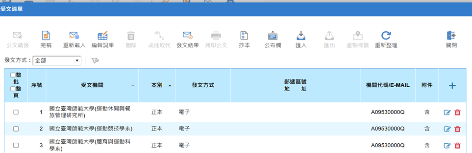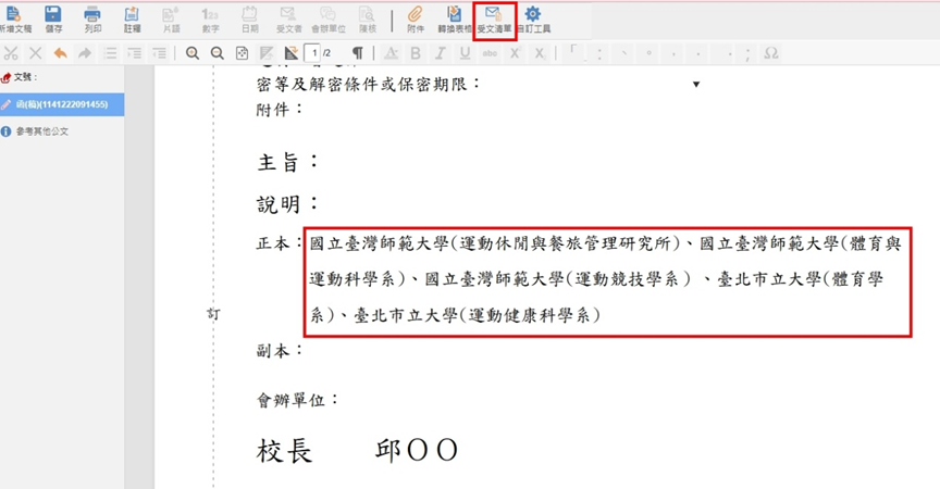 請同仁於製作函稿時,受文者正本如需發送給同一機關(學校)不同內部單位或個人,函稿撰寫方式為「機關(學校)全銜+內部單位名稱」,並請逐項以半形括弧分開,受文清單(文稿製作上方功能按鍵)才能帶出機關代碼,於電子交換時逐一發送給該機關(學校)各內部單位,範例如下;
